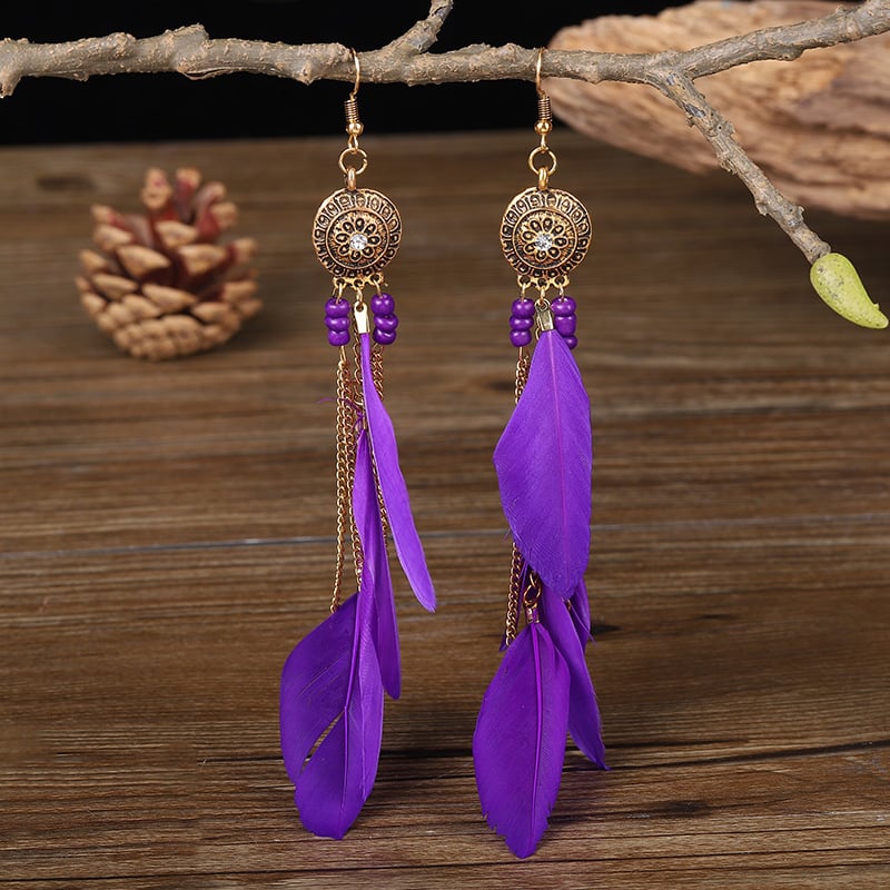 Retro colorful chain tassel earrings Bohemian feathers earrings