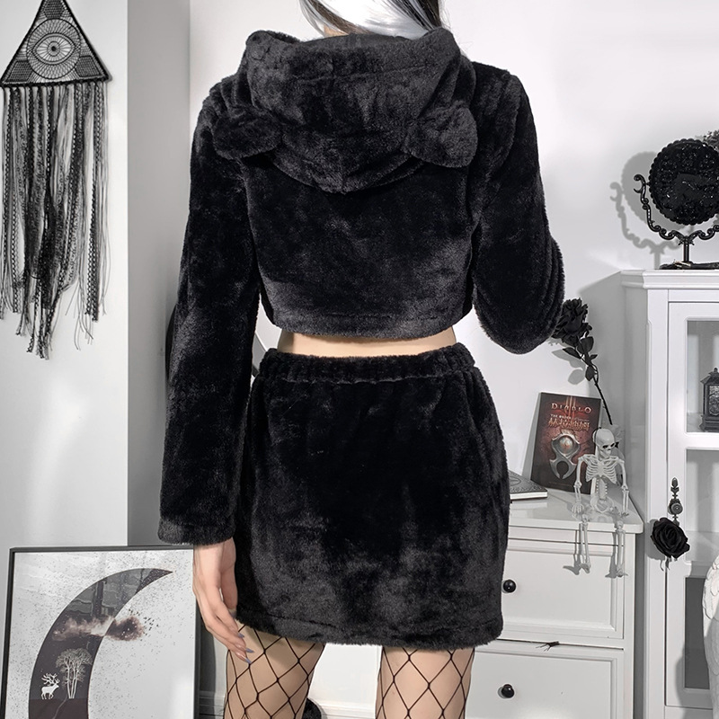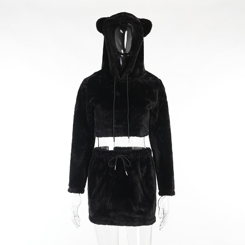 Cute Fuzzy Bear Ears Hoodie Top With Skirt Shirt