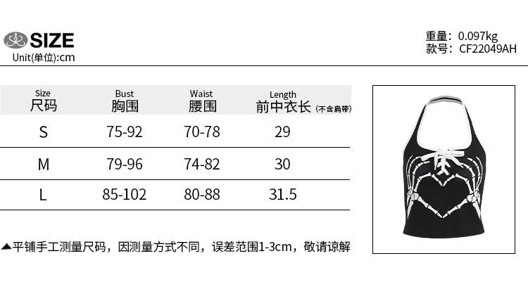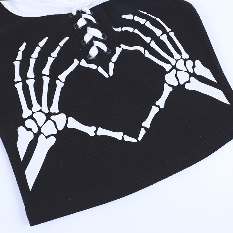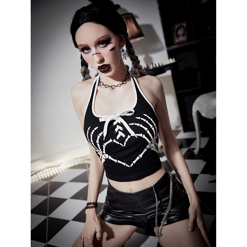Show off your spooky side with this sexy skeleton print halter top. This top features a skeleton handprint on the front, forming a love heart shape with the fingers. The halter neck design and the cropped length add some extra sass to your outfit. Perfect for Halloween or any day you want to make a statement.