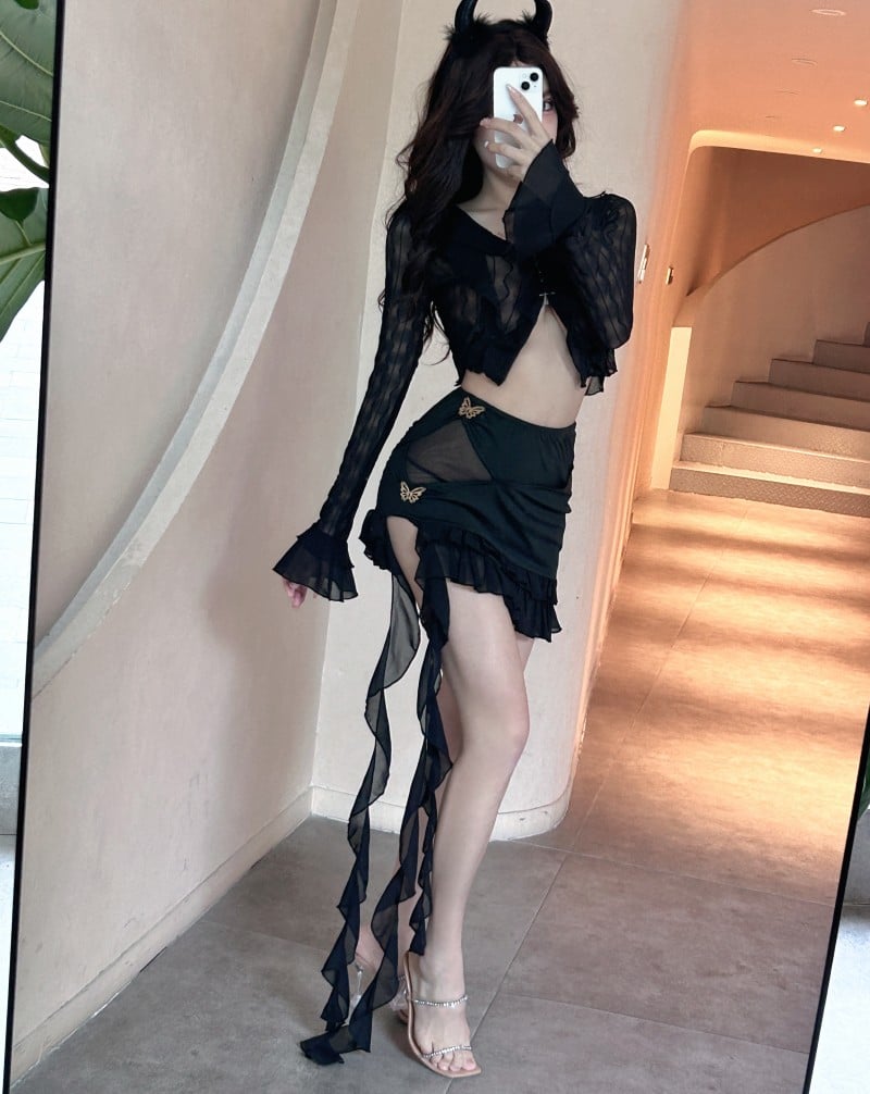 Make a bold statement with our Black Ruffled Short Skirt – a perfect blend of edgy and elegant. This chic skirt features playful ruffles, intricate butterfly pin details, and a touch of allure with sexy mesh and long tassels. Embrace the power of individuality and elevate your style with a piece that is both daring and sophisticated. Step into confidence with our Black Ruffled Short Skirt – where fashion meets fierce in every flutter and sway.🖤