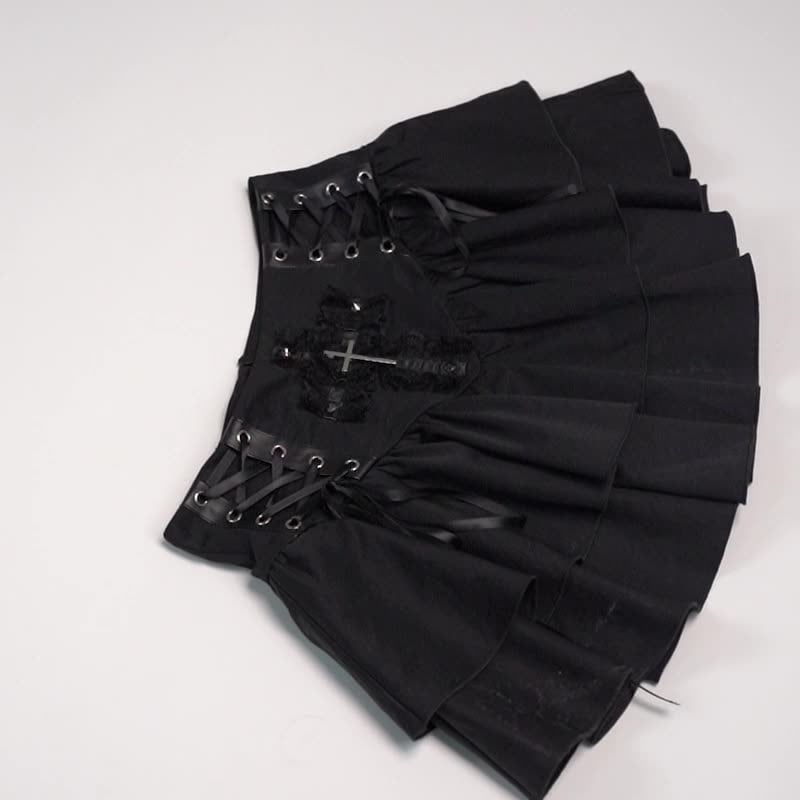 Unleash your inner rebel with our Black Punk Lacy Cross A-Line Skirt. This edgy yet feminine piece features intricate black lace detailing and a striking cross design, adding a bold punk aesthetic. The flattering A-line silhouette offers a comfortable and stylish fit. Perfect for making a statement, this skirt pairs effortlessly with band tees, chunky boots, or delicate blouses for a contrasting look. Embrace your unique style with this must-have punk-inspired skirt.
