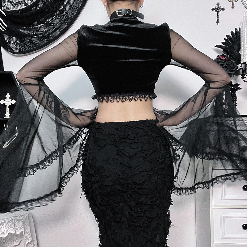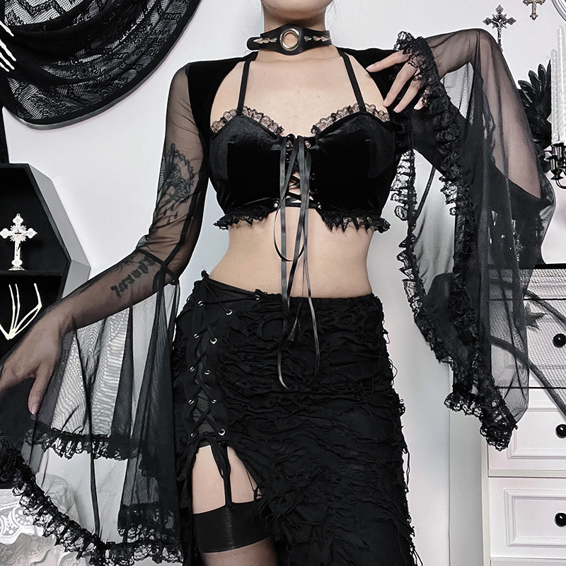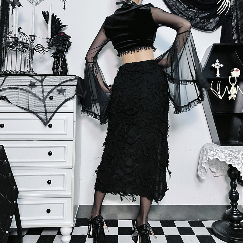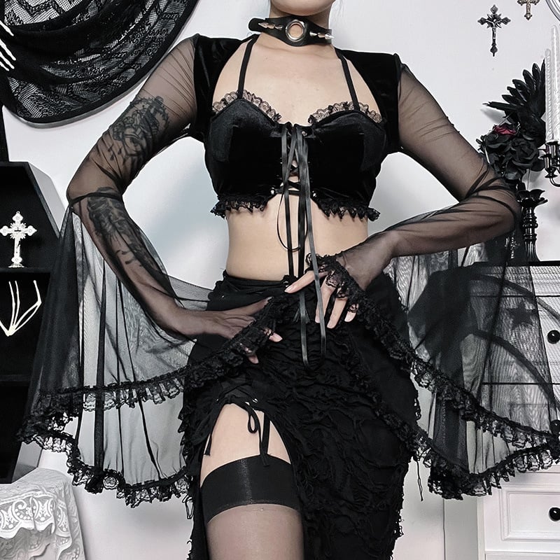 Stunning Split Hem Skirt: The skirt is designed to captivate with a striking split hem that allows you to move with grace and confidence. The bandage lace detail adds a touch of edginess, balancing the ensemble's femininity with a hint of allure.