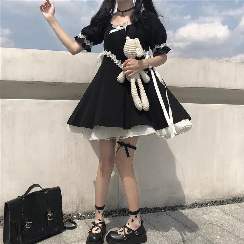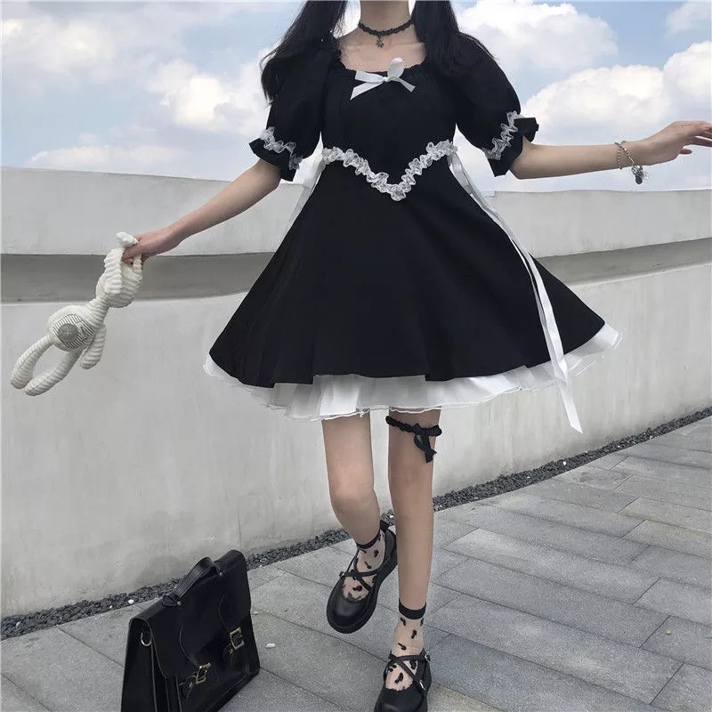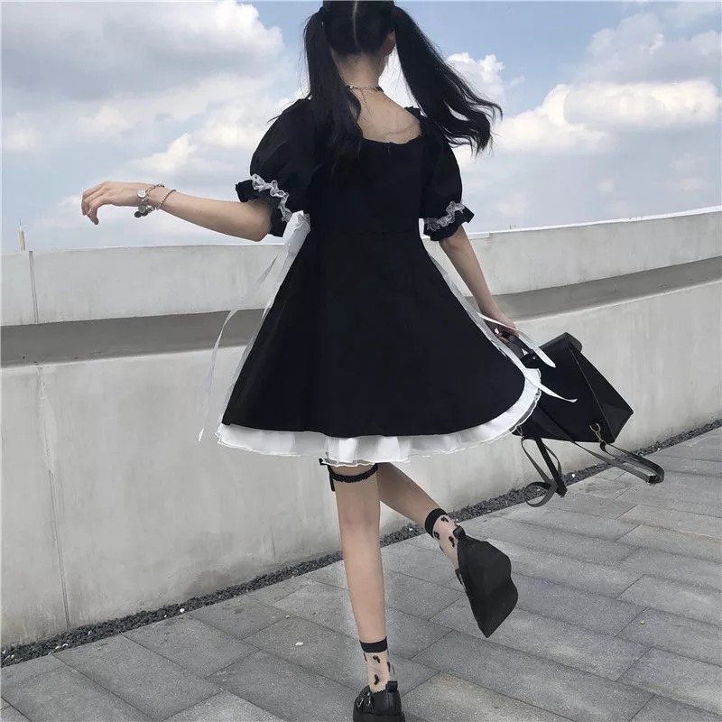 Harajuku Kawaii Cute Short Puff Sleeve Black Dress