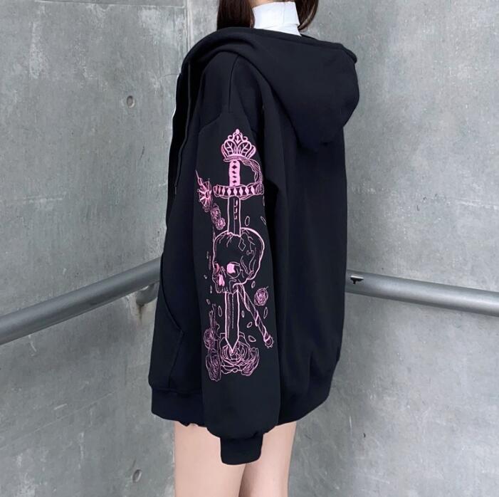 Harajuku Skull Print Zipper Up Black Hoodie Jacket
