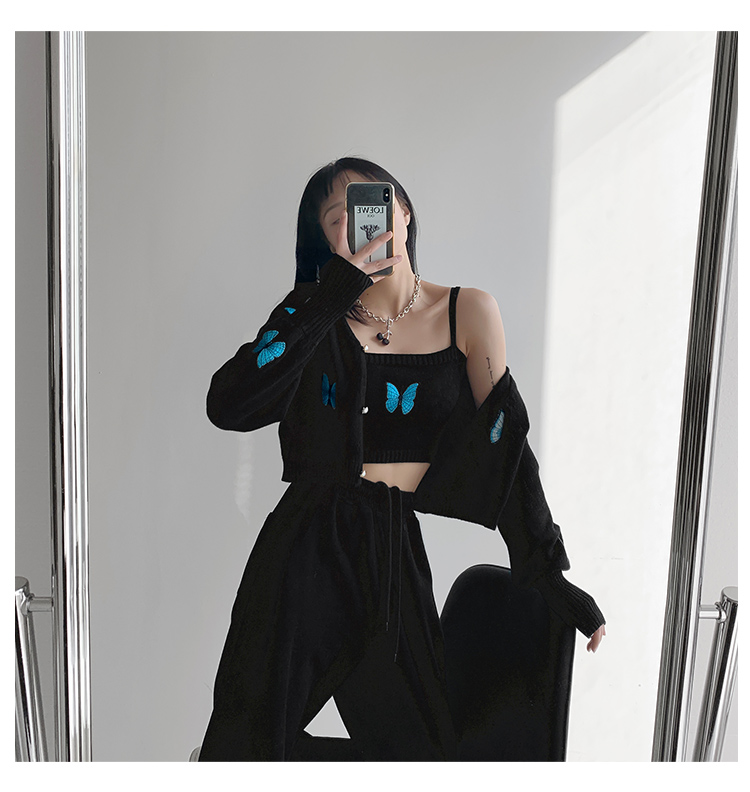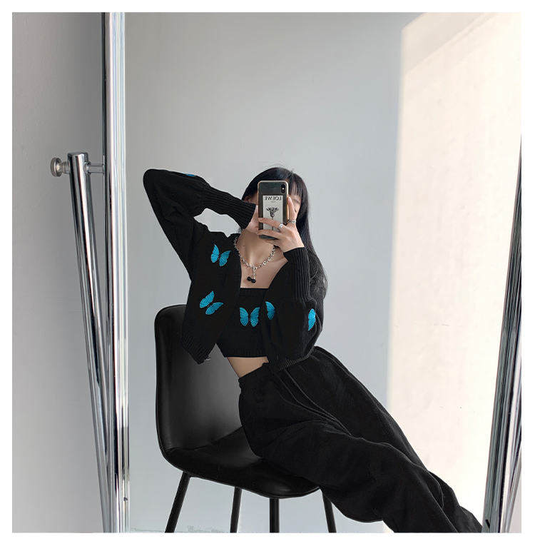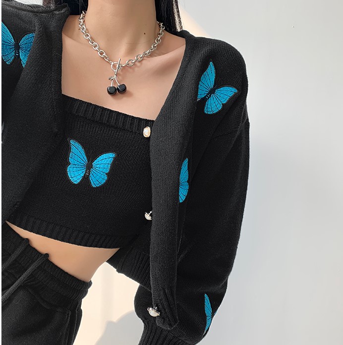 Butterfly Embroidered Knitted Cardigan And Tank Top - BLACK