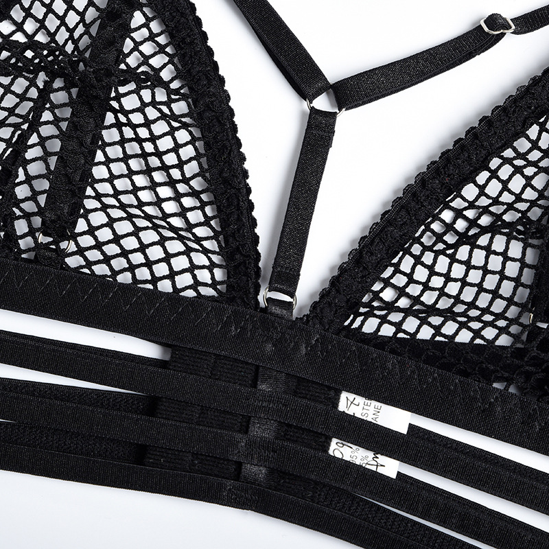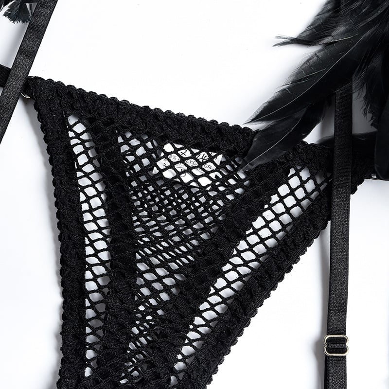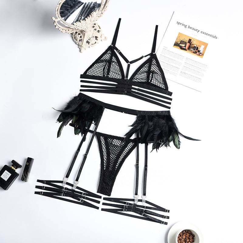 Craftsmanship lace real feather mesh see-through underwear cross four-piece set