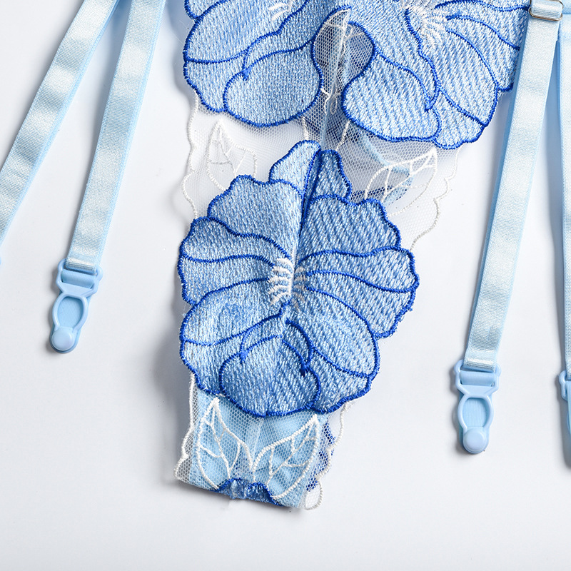 Sexy blue flower embroidery straps bow garter belt three-piece suit
