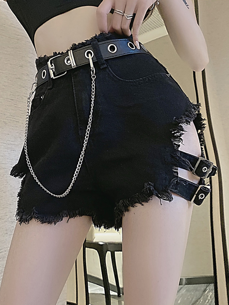 Hollow Strap Black Denim Shorts