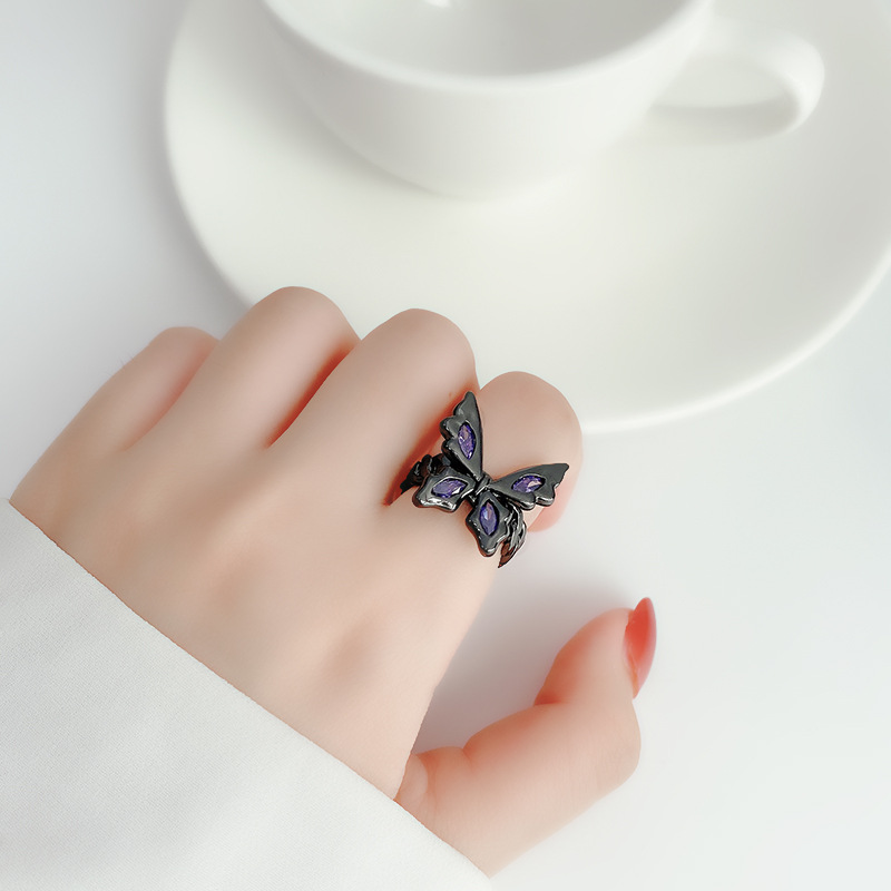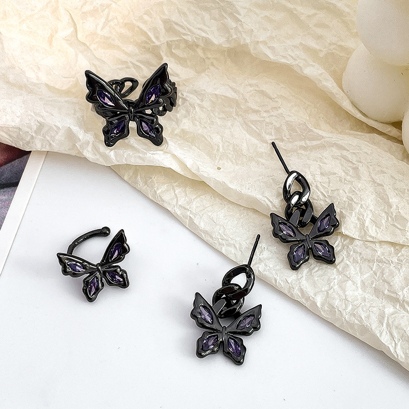 3pcs purple zircon butterfly ring black butterfly tassel earrings set
