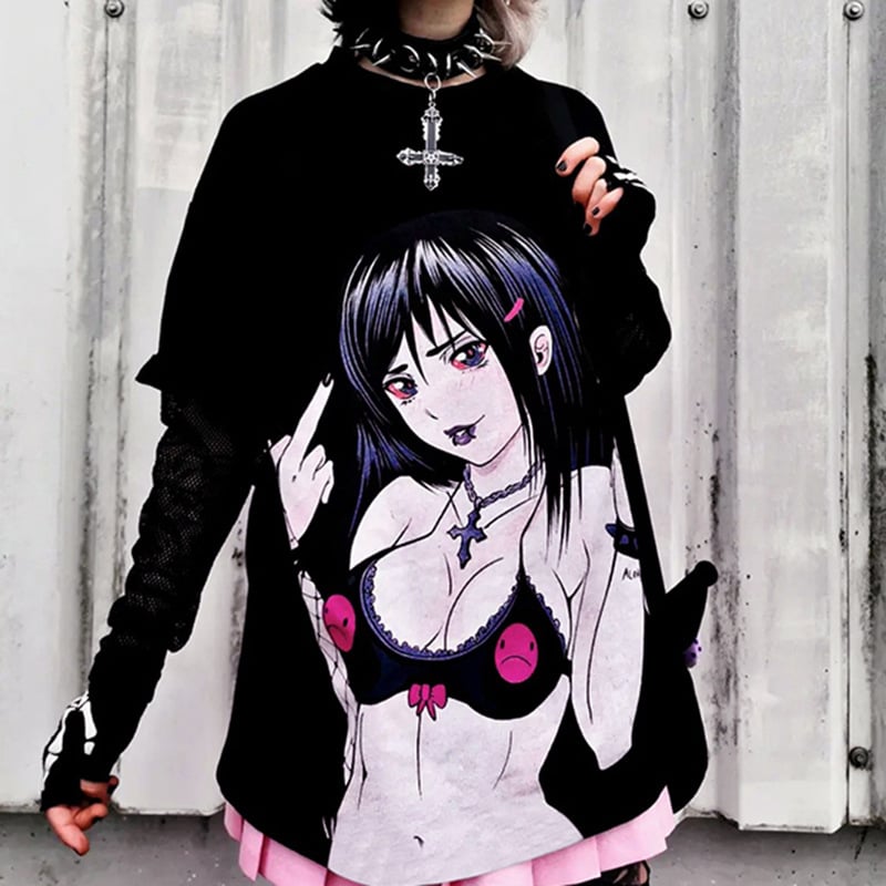 Gothic Girl Prints Mesh Sleeve T-shirt