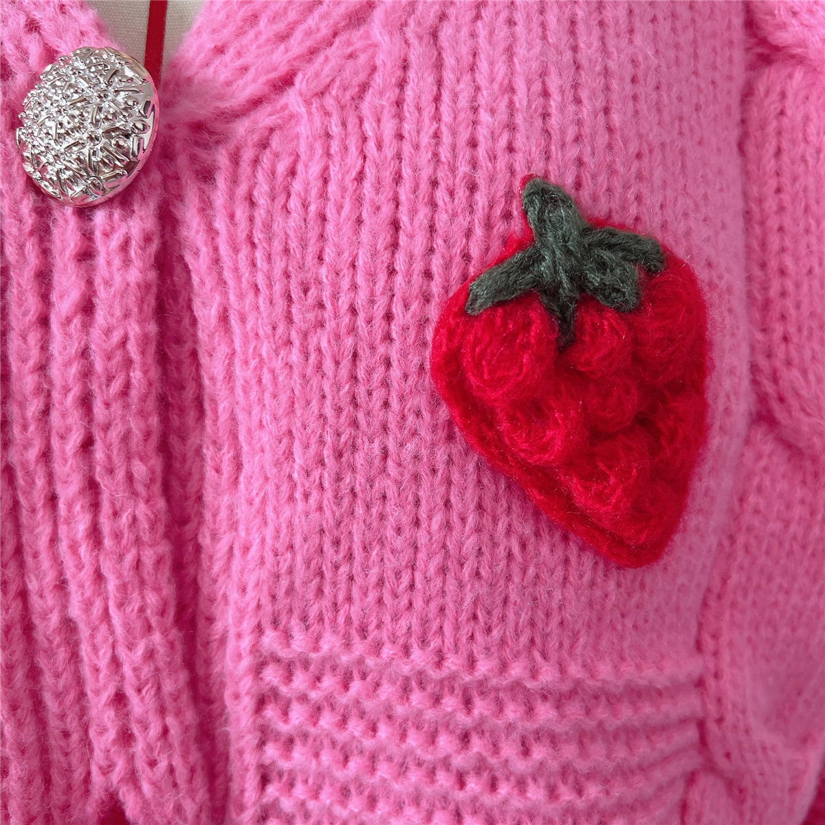 Puff sleeve knitted cardigan with puffy strawberry appliques and cable knit detailing. Material: 100% acrylic Size: S-XL
