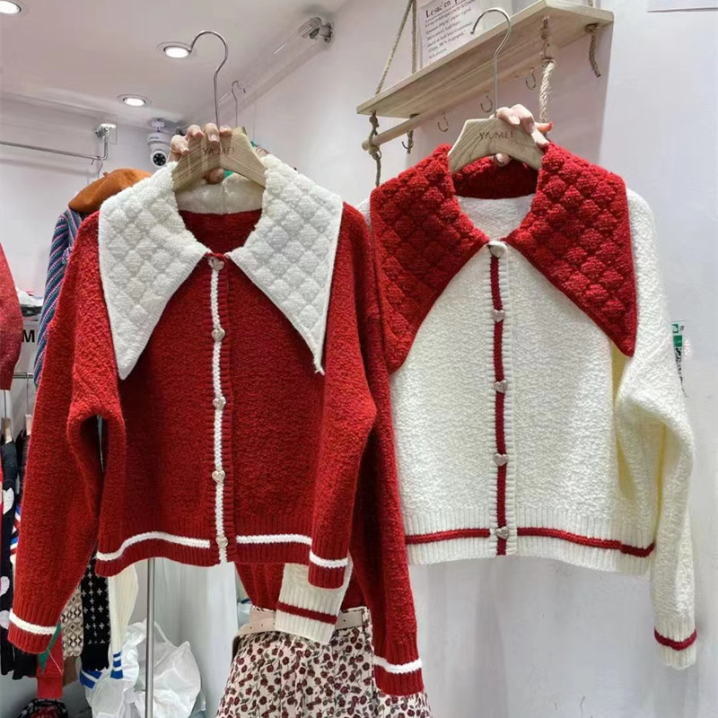 Korean Doll Collar Love Button Design Knitted Cardigan