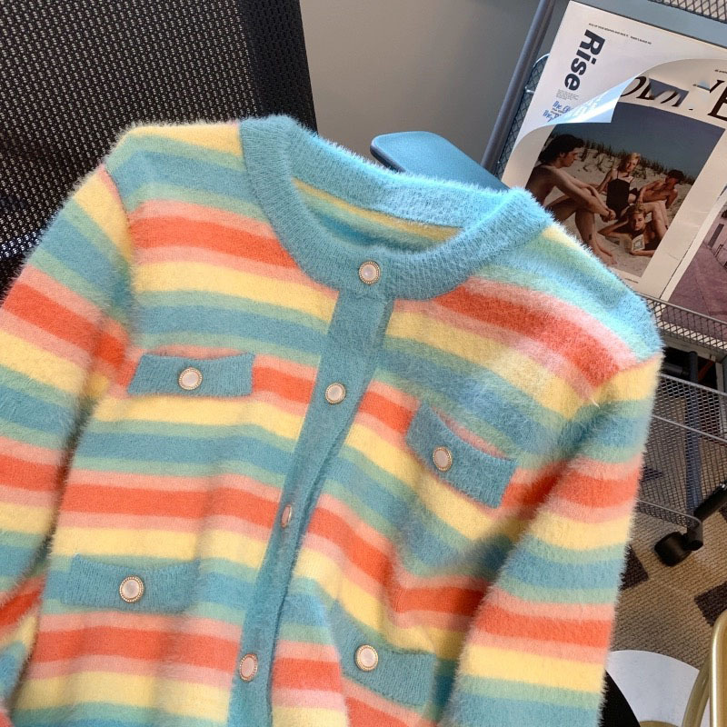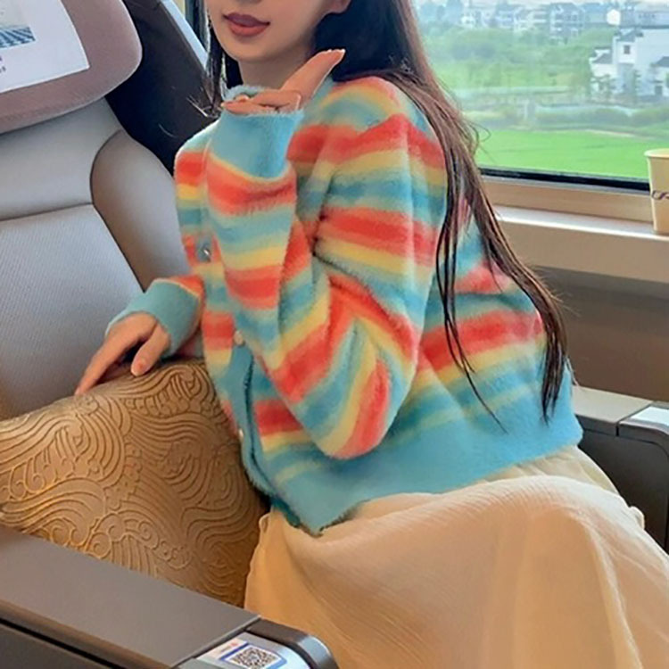 Rainbow Stripes Round Neck Buttons Up Cardigan