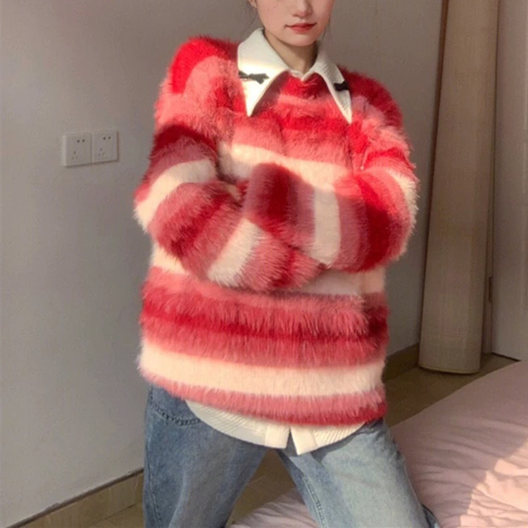 Elevate your style with our Imitation Mink Pink Striped Sweater. This sweater exudes elegance with its soft, luxurious feel and subtle pink stripes. Crafted for both warmth and fashion, it's a versatile addition to your wardrobe. Whether you're dressing up for a special occasion or seeking comfort and style in your everyday look, this sweater offers a touch of sophistication that sets it apart. Update your fashion game with this exquisite piece that's as cozy as it is chic.