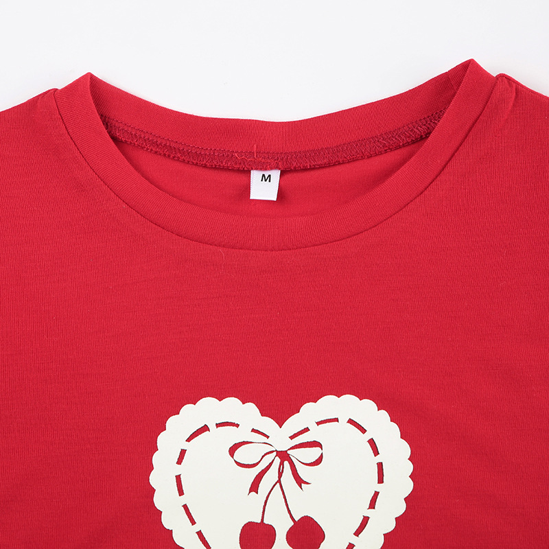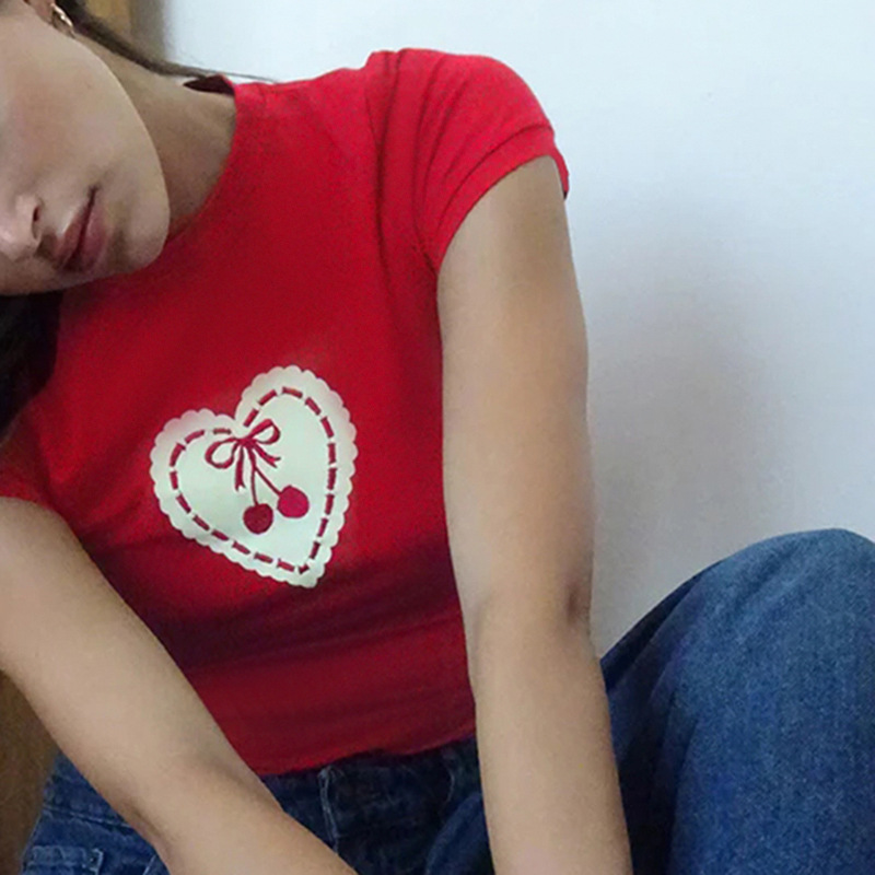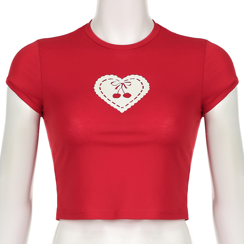 Calling all cherry lovers! This adorable Cherry Heart Red Top features a playful cherry graphic designed in a heart shape. The classic crewneck and short sleeves make it perfect for summer. Crafted in a vibrant red hue, this top is sure to add a touch of sweetness to your wardrobe.