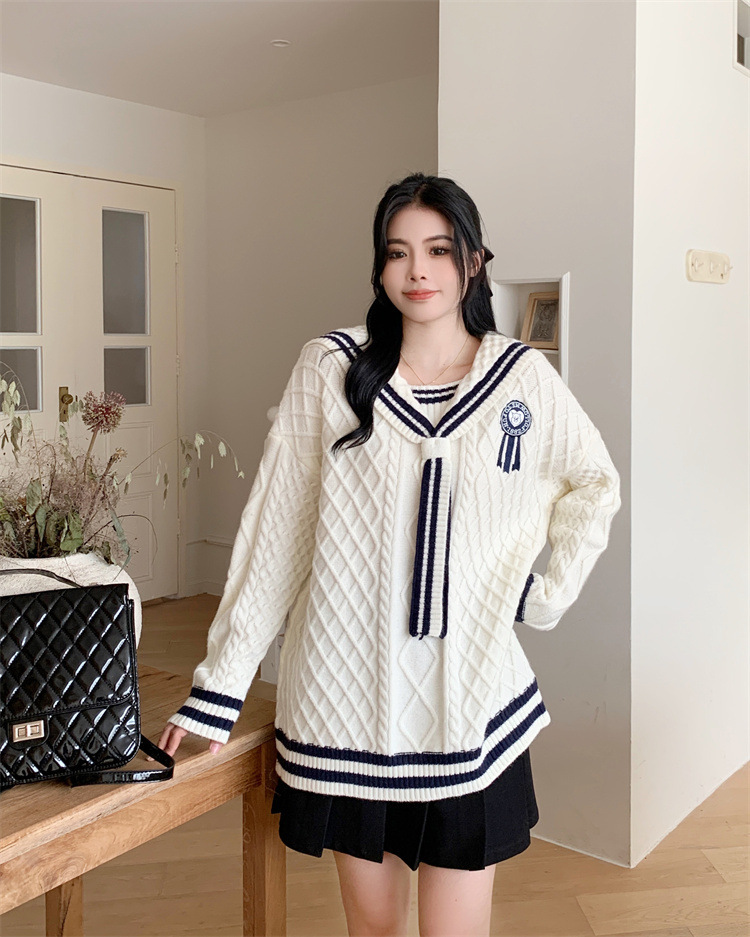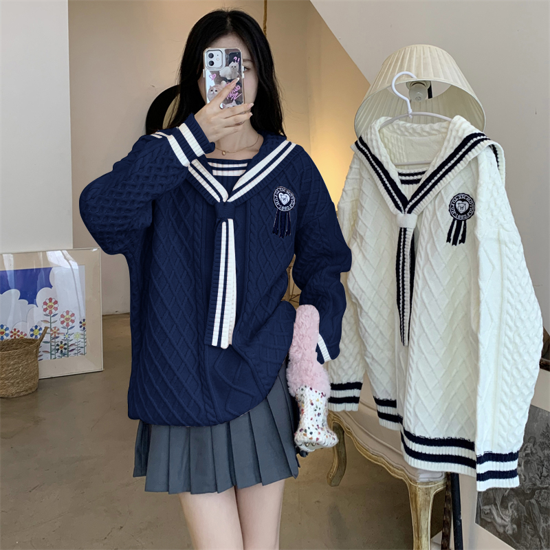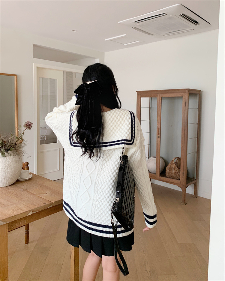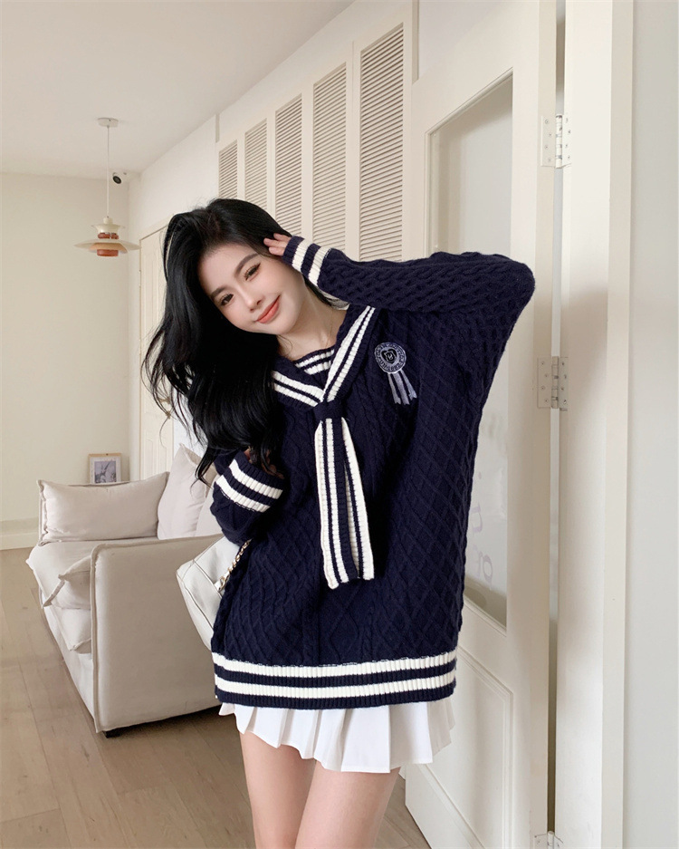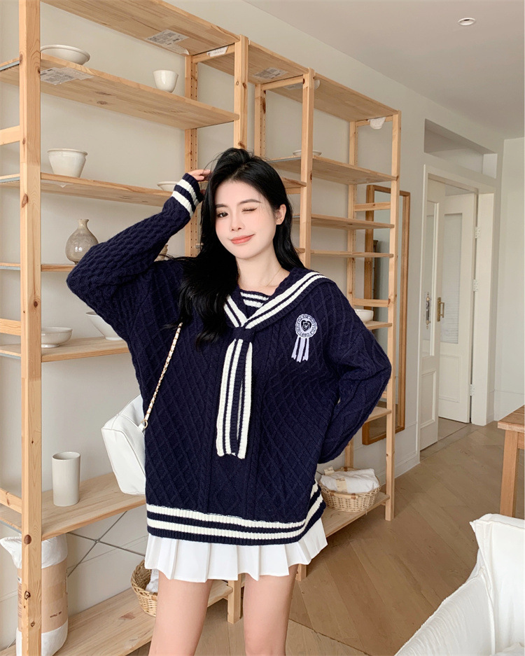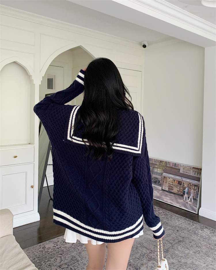 Channel your inner sailor with our classic Navy Stripe Sailor Collar Sweatshirt! This cozy pullover features a flattering striped pattern in navy and white, accented by a crisp sailor collar with a touch of nautical flair. Made with soft fabric, it's perfect for layering or wearing on its own for a timeless look.