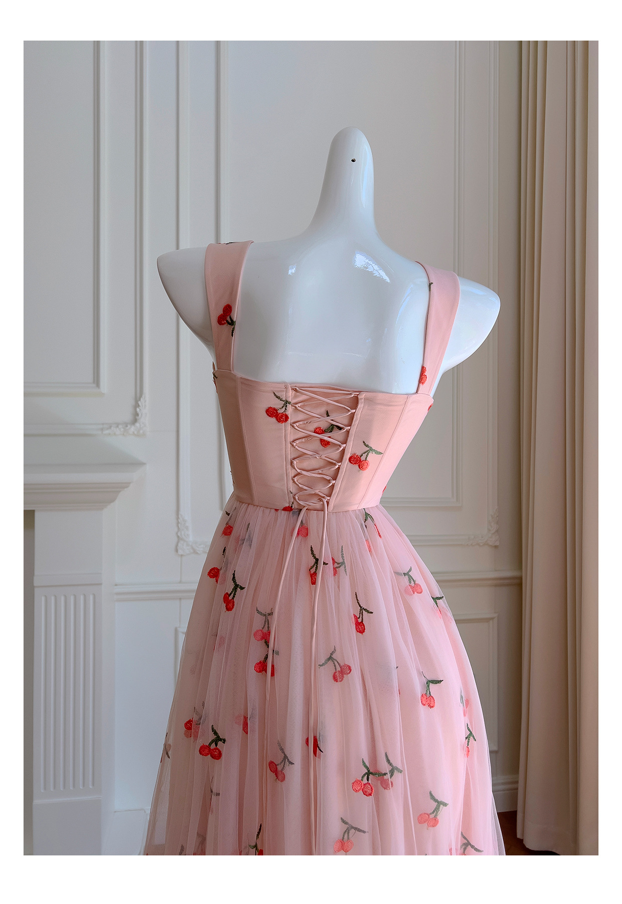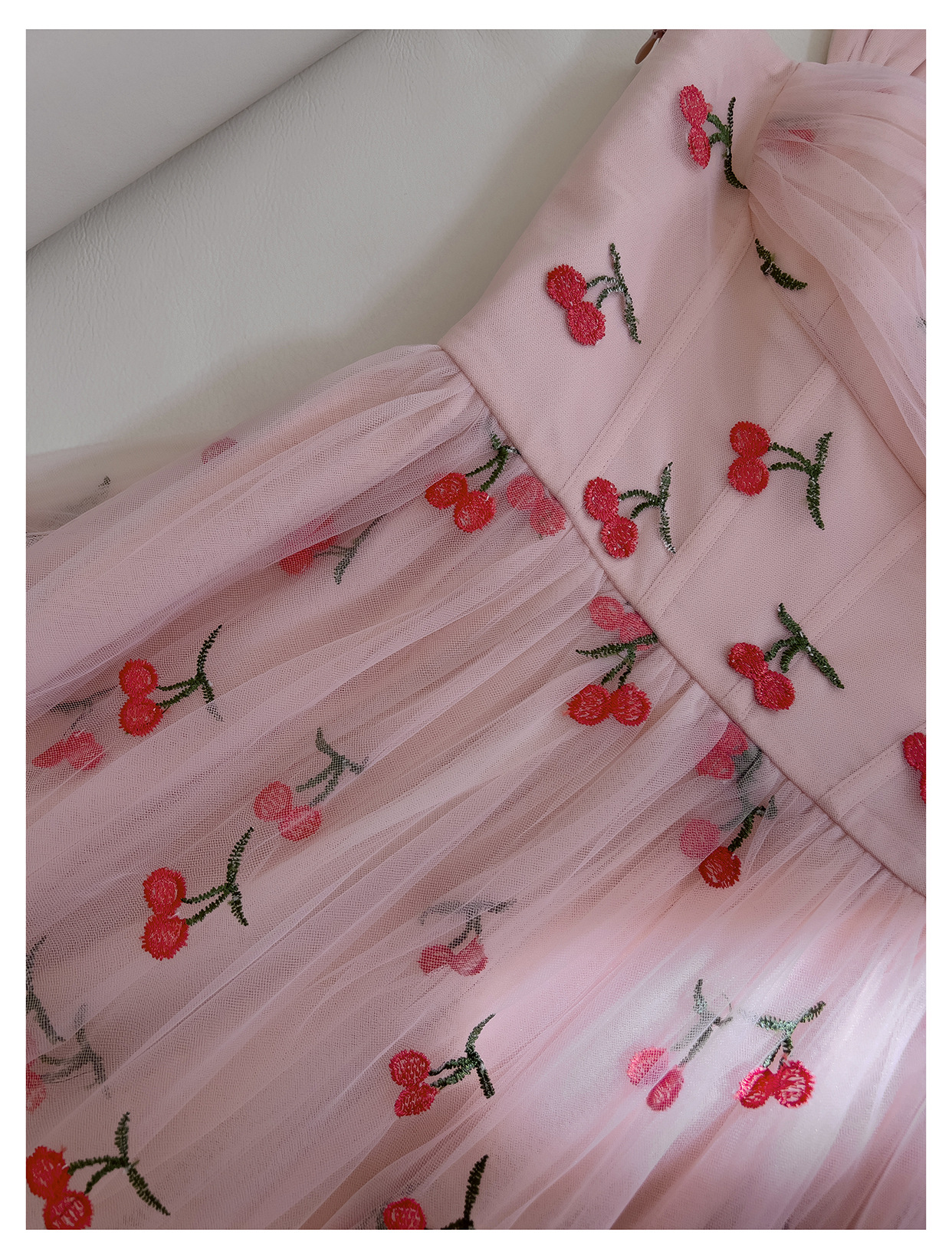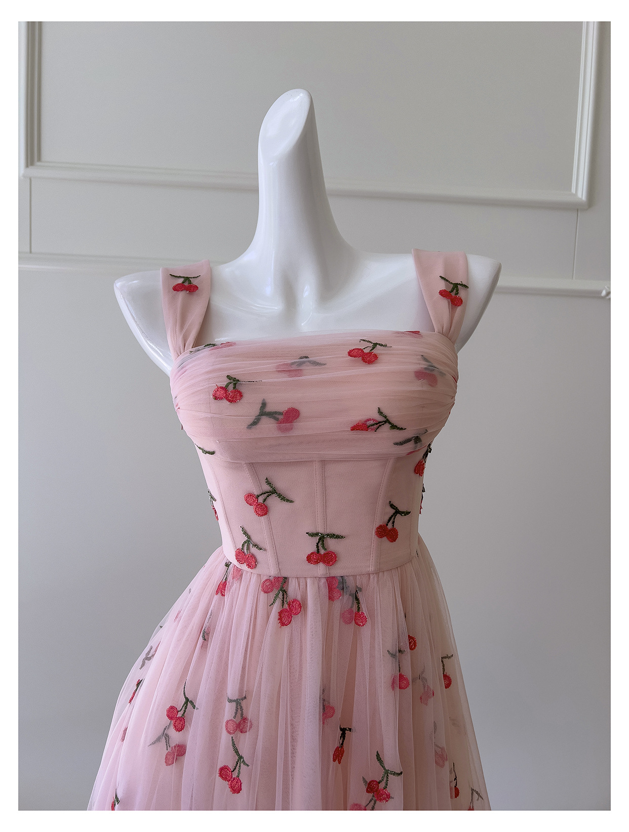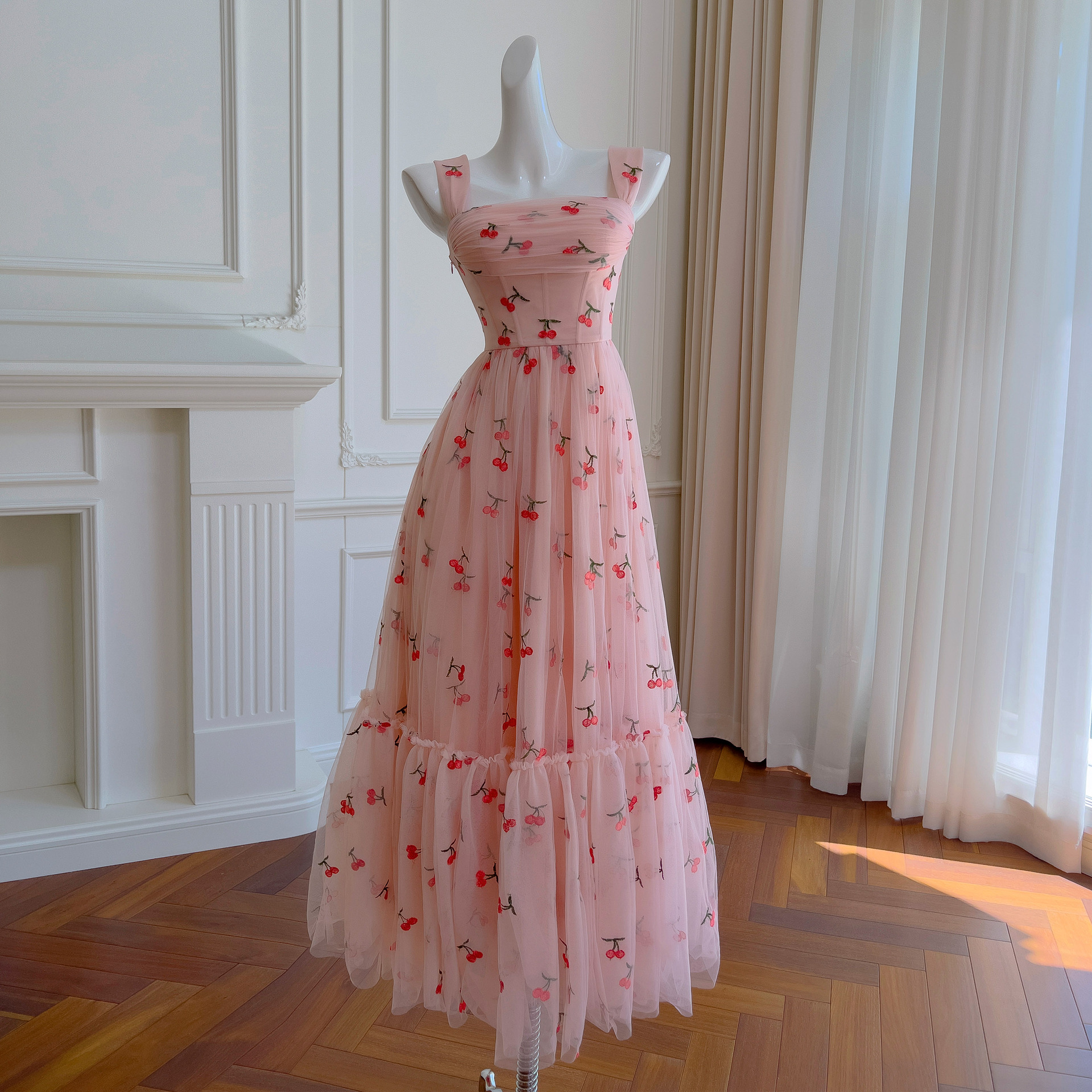 Perfect for warm days and evenings, this dress is lightweight and breathable, ensuring comfort without sacrificing style. The sheer mesh creates a subtle, alluring effect, while the vibrant cherry pattern brings a fresh, feminine touch.