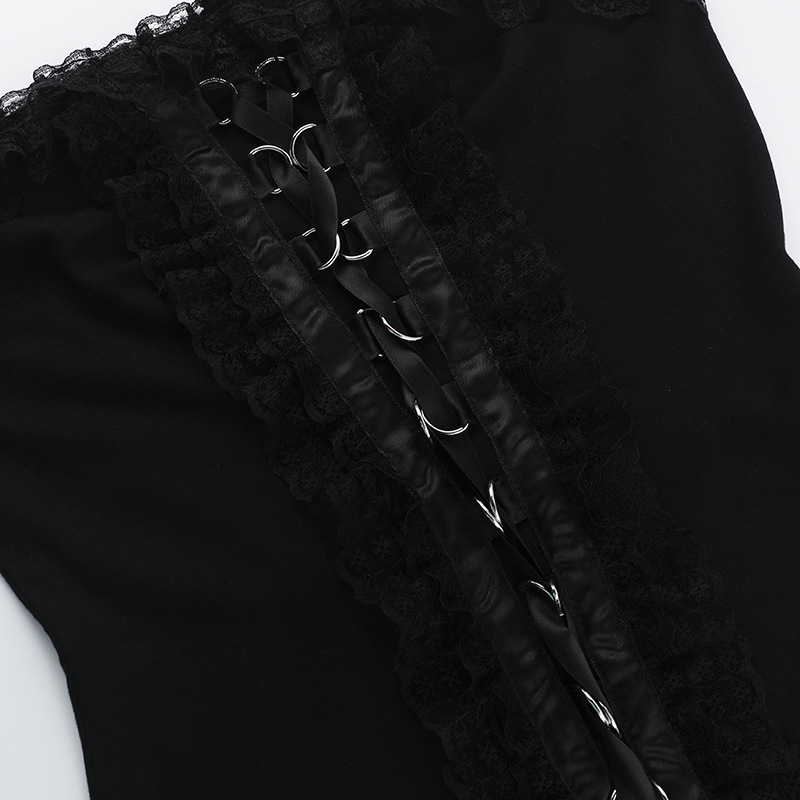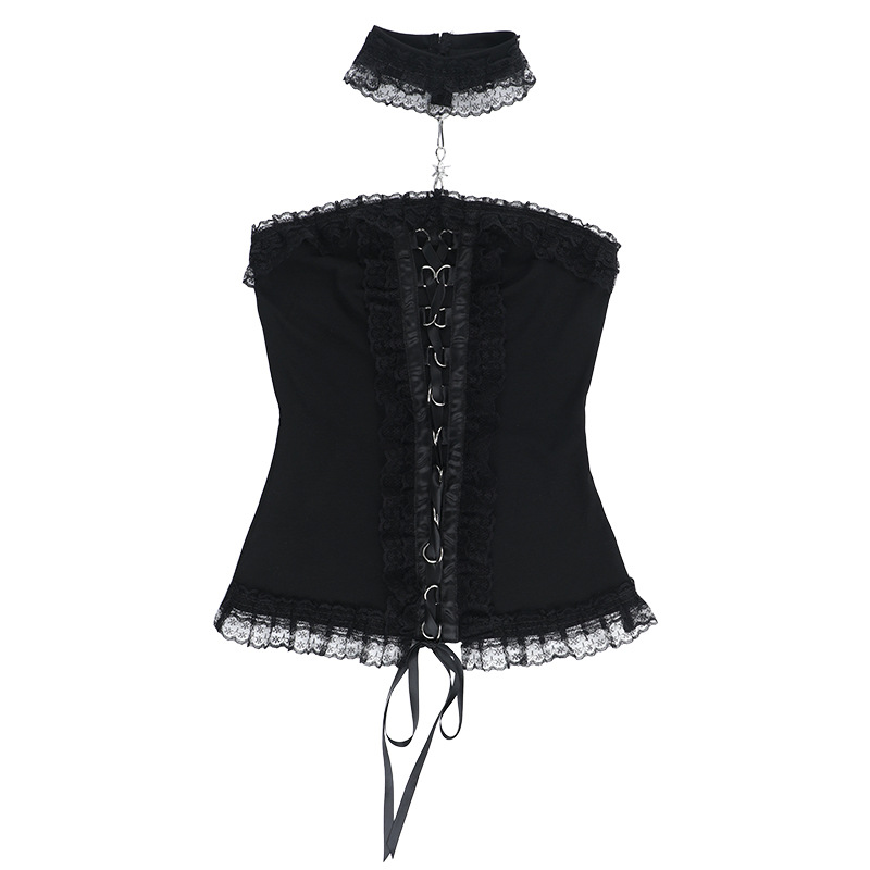 Embrace your dark romantic side with our Gothic Black Lace Tube Top. Featuring a delicate lace collar and striking front lace-up detail, this top exudes edgy elegance. The intricate black lace creates a captivating texture and silhouette. Perfect for adding a touch of gothic flair to any outfit, from casual to evening wear. Dare to be different and unleash your inner darkness with this must-have piece.