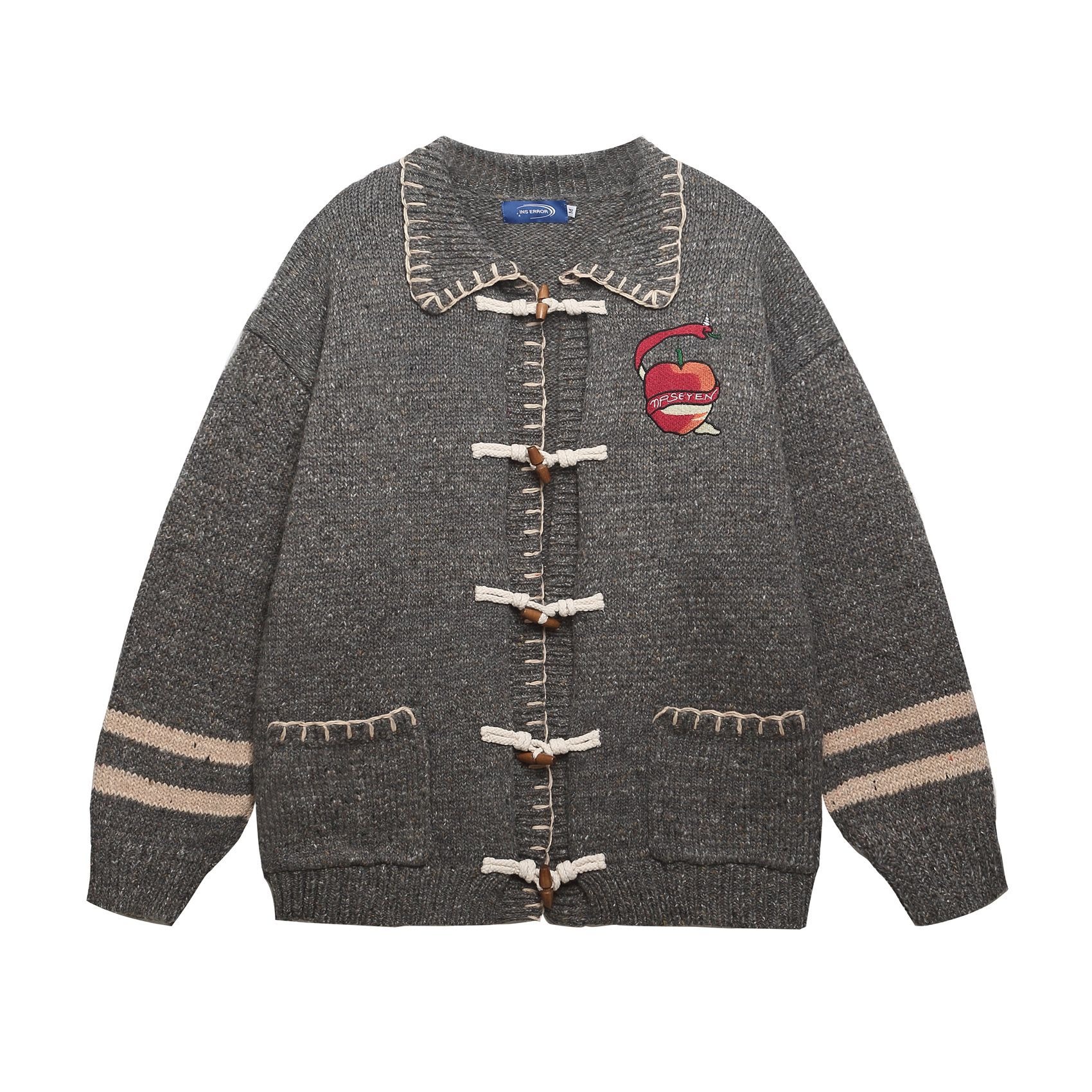 Embrace timeless style with this charming vintage-inspired cardigan. Featuring a classic lapel design and button-up front, it's perfect for layering. The bold stripes on the sleeves and intricate apple embroidery on the chest add a playful yet sophisticated touch. Made from a soft, comfortable knit, this cardigan is a versatile piece that adds a pop of retro flair to any outfit.